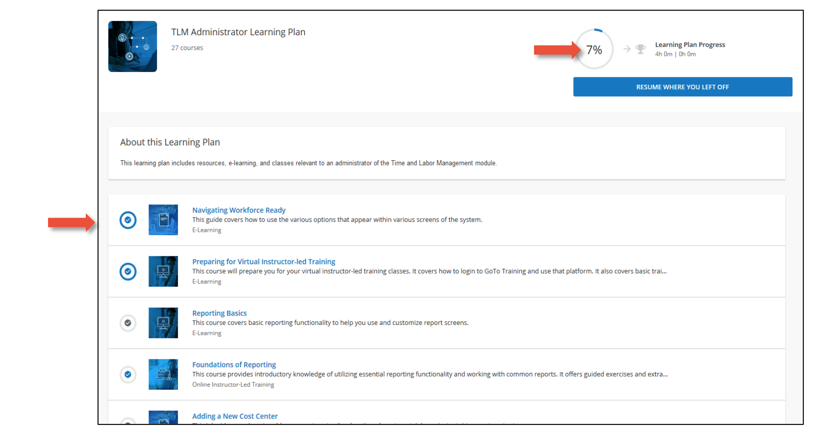 - Within the learning plan, you can start a course by clicking the name or course tile. As you complete courses, they will be marked with a checkmark and your overall progress will update in the upper right corner of the page. Hitting the back to courses link from within a learning plan will take you back to your complete course and learning plan list. To get back into the learning plan you can access Show My Learning Plans from the dashboard or filter the My Courses and Learning Plans by Learning Plan only. Note: If a course is showing a greyed-out lock symbol next to it, this means that the course has pre-requisites. You will need to complete prerequisites before you can start the course.