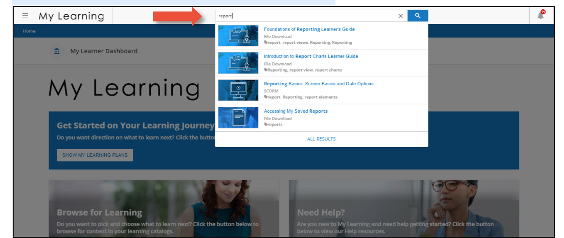 Searching is the best way to quickly find content based on a key word or phrase. To search, type a key word in the search field at the top of any page within the My Learning environment. Then, either click the name of your chosen item from the drop down or click All Results to show a full page of your search results.